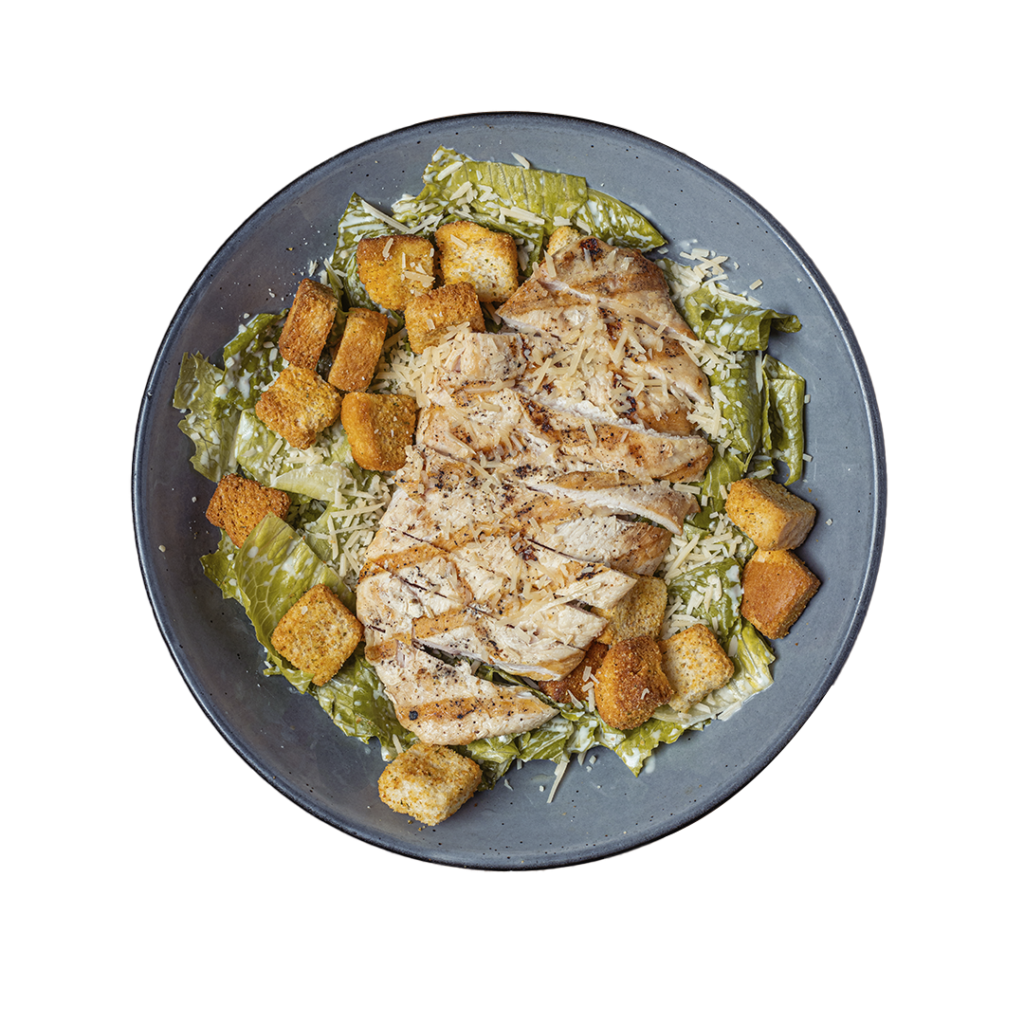 Ensalada de lechugas, almendras y tallarines de arroz tostado con aderezo oriental, acompañada de pollo apanado o a la parrilla estilo teriyaki.