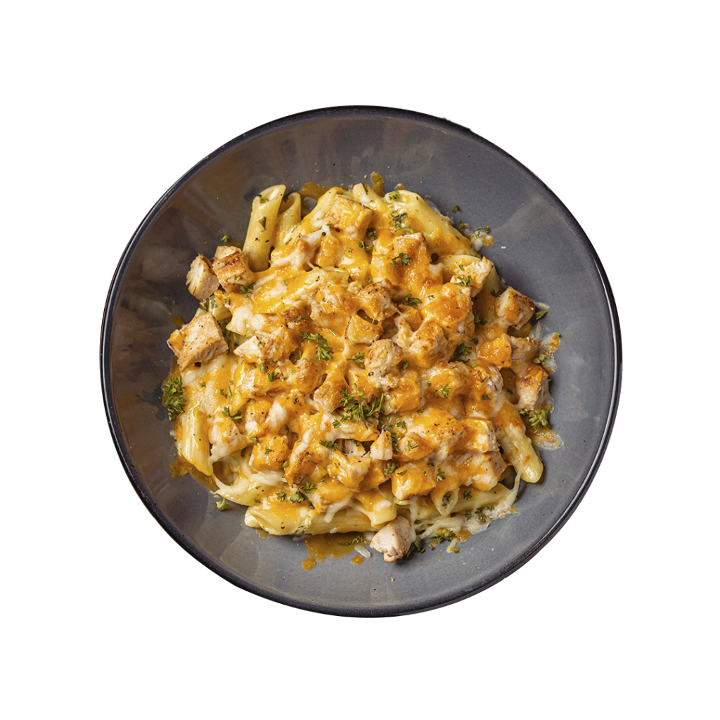 Pechuga de pollo marinada con cilantro y lima, con aderezo México-Ranch y queso Jack Cheddar gratinado. Acompañada de arroz mexicano, pico de gallo y tiras de tortilla frita.