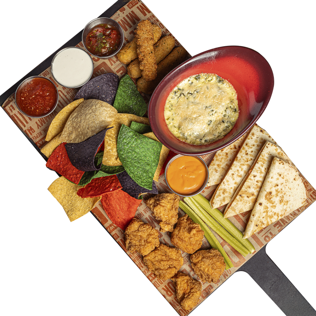 Combinación de espinacas y alcachofas, salteadas con una cremosa mezcla de quesos asiago y partisano. Acompañado de salsa de la casa y chips.
