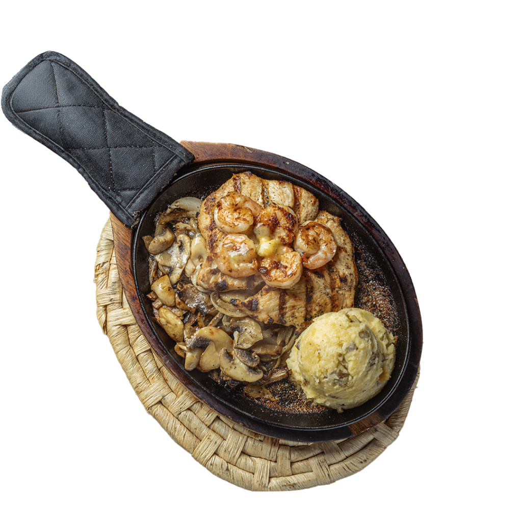 Tierno corte acompañado de suculentos camarones y quesos italianos. Se sirve con Puré de papa y vegetales al vapor.